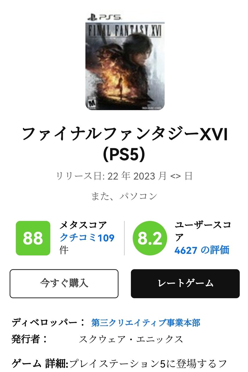 FF16、ユーザースコア8.2へ!完全に神ゲー!