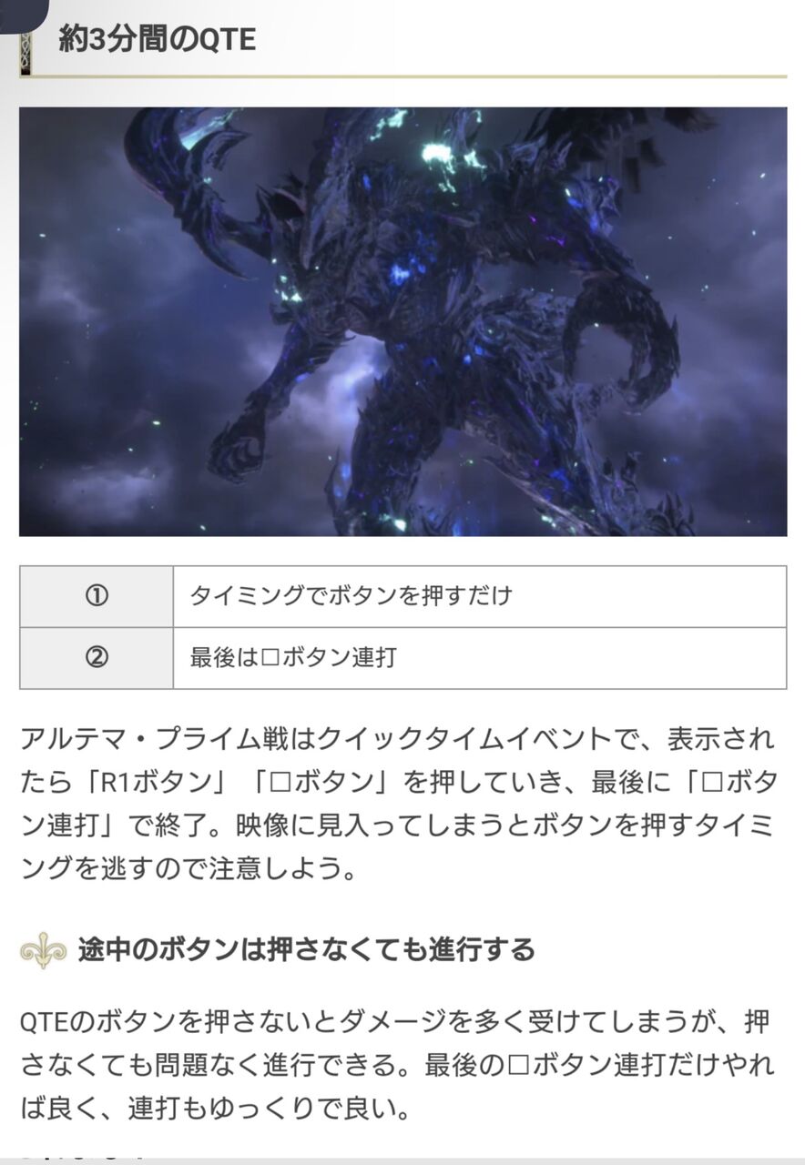 FF16攻略サイト「タイミングでボタン押すだけ。最後は□ボタン連打。途中のは押さなくてもいい」