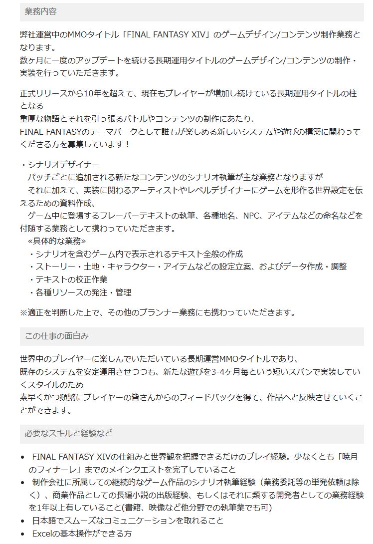 「FF14」、シナリオデザイナーを募集していることが判明!「パッチごとに追加される新コンテンツのシナリオ執筆が主な業務、必要スキルは少なくとも暁月メインクエの完了」など