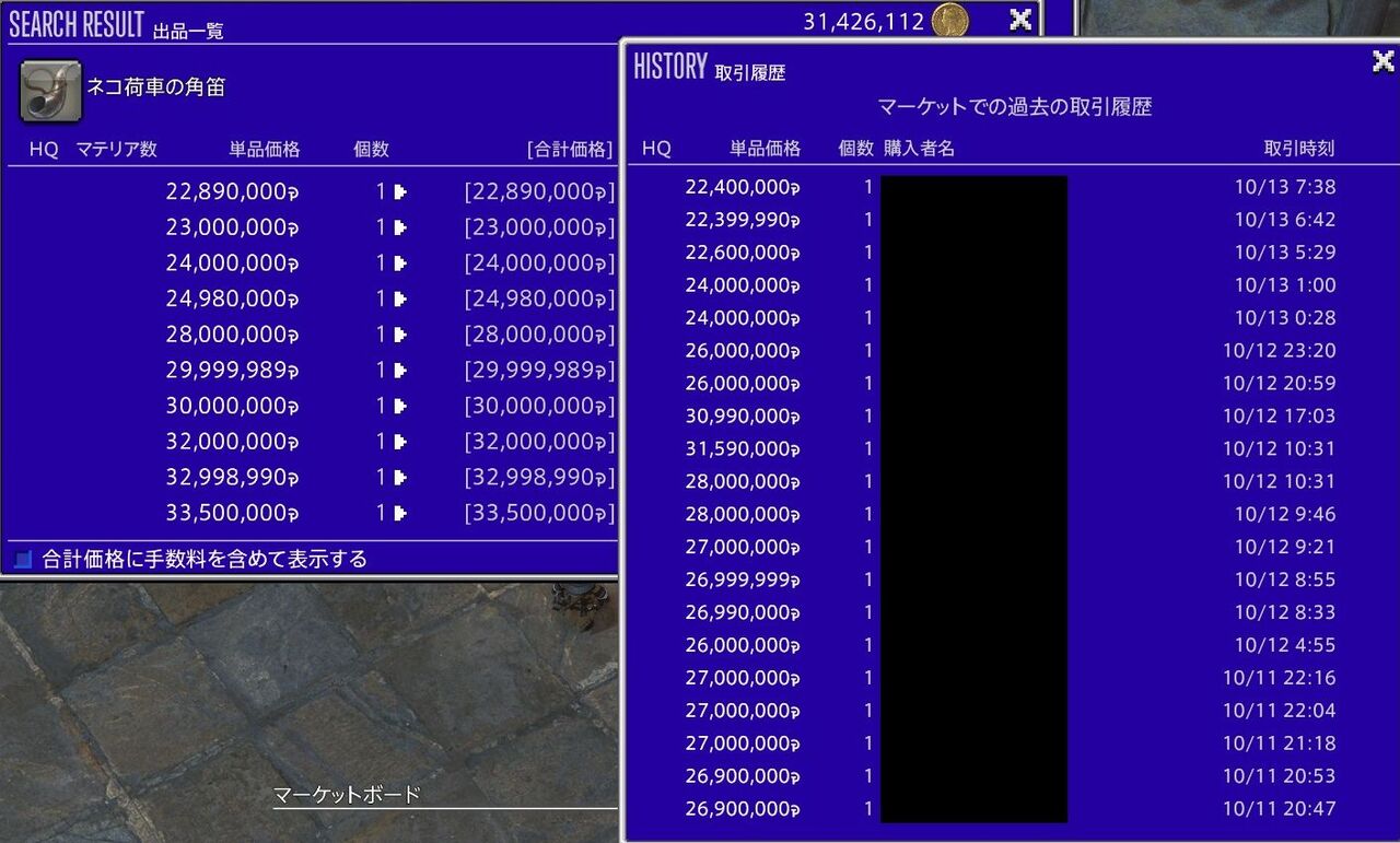 【FF14】モンハンワイルズコラボのネコ荷車マウントのマケボ価格がかなり下がるもそれでも2000万。堅実に極50周する人、Nでロット勝ちを狙う人など様々