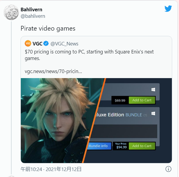 外国人「FF7Rが70ドルは高すぎる。海賊版でプレイする」